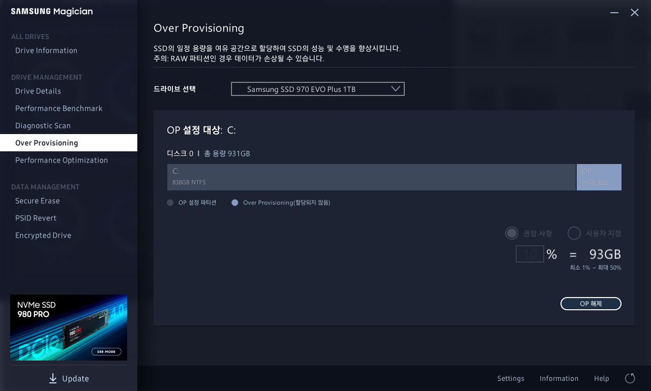 SAMSUNG Magicion 메뉴 중 SAMSUNG Magicion Over Provisioning 메뉴에서 간단하게 클릭 몇 번만으로 설정할 수 있습니다. 최소 1%에서 최대 50%까지 설정 가능하며 Over Provisioning 비율을 별도로 정하지 않았다면 권장 사항으로 세팅해주면 됩니다.