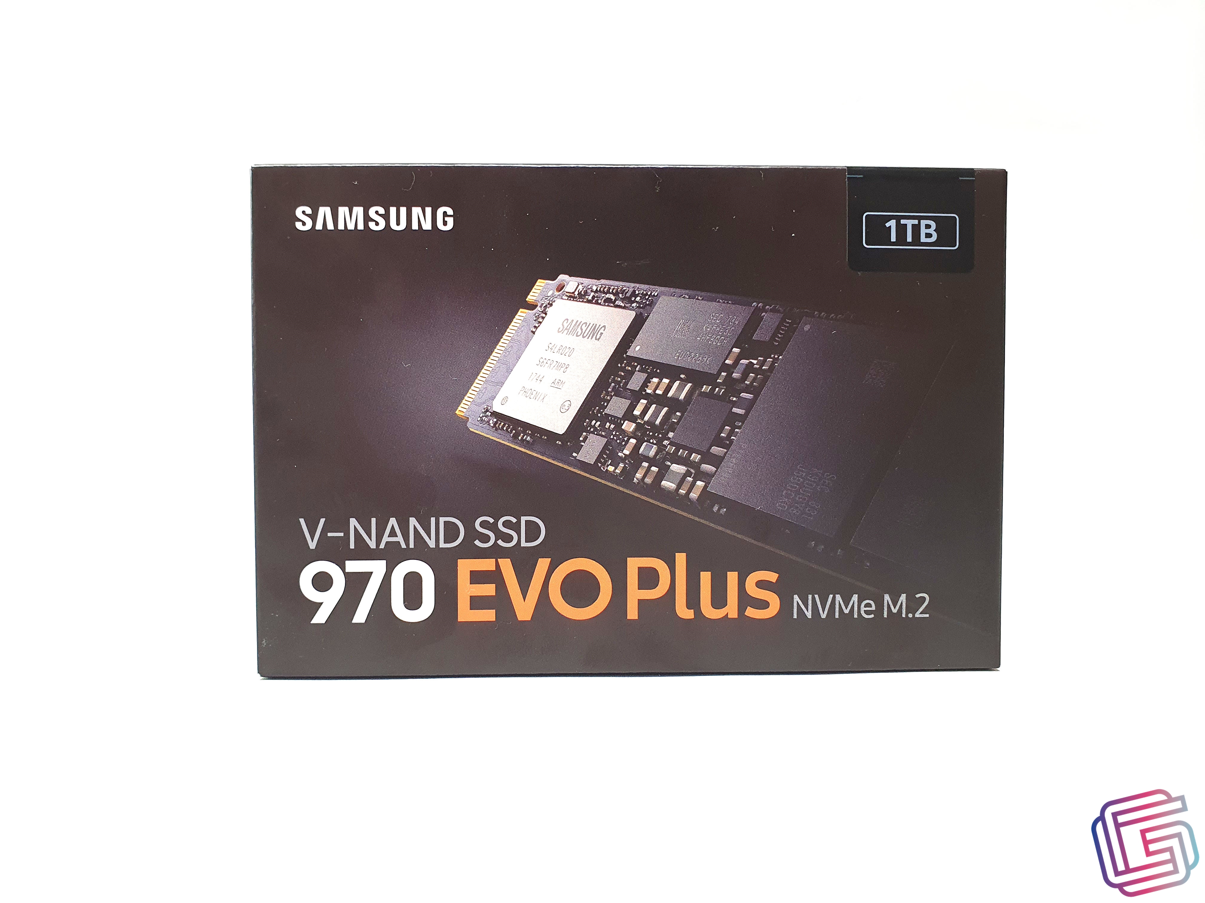 전면부에는 970 EVO PLUS NVMe SSD의 큰 이미지와 제품명 1TB 용량이 표시하는 스티커가 우측 상단에 붙어 있습니다.