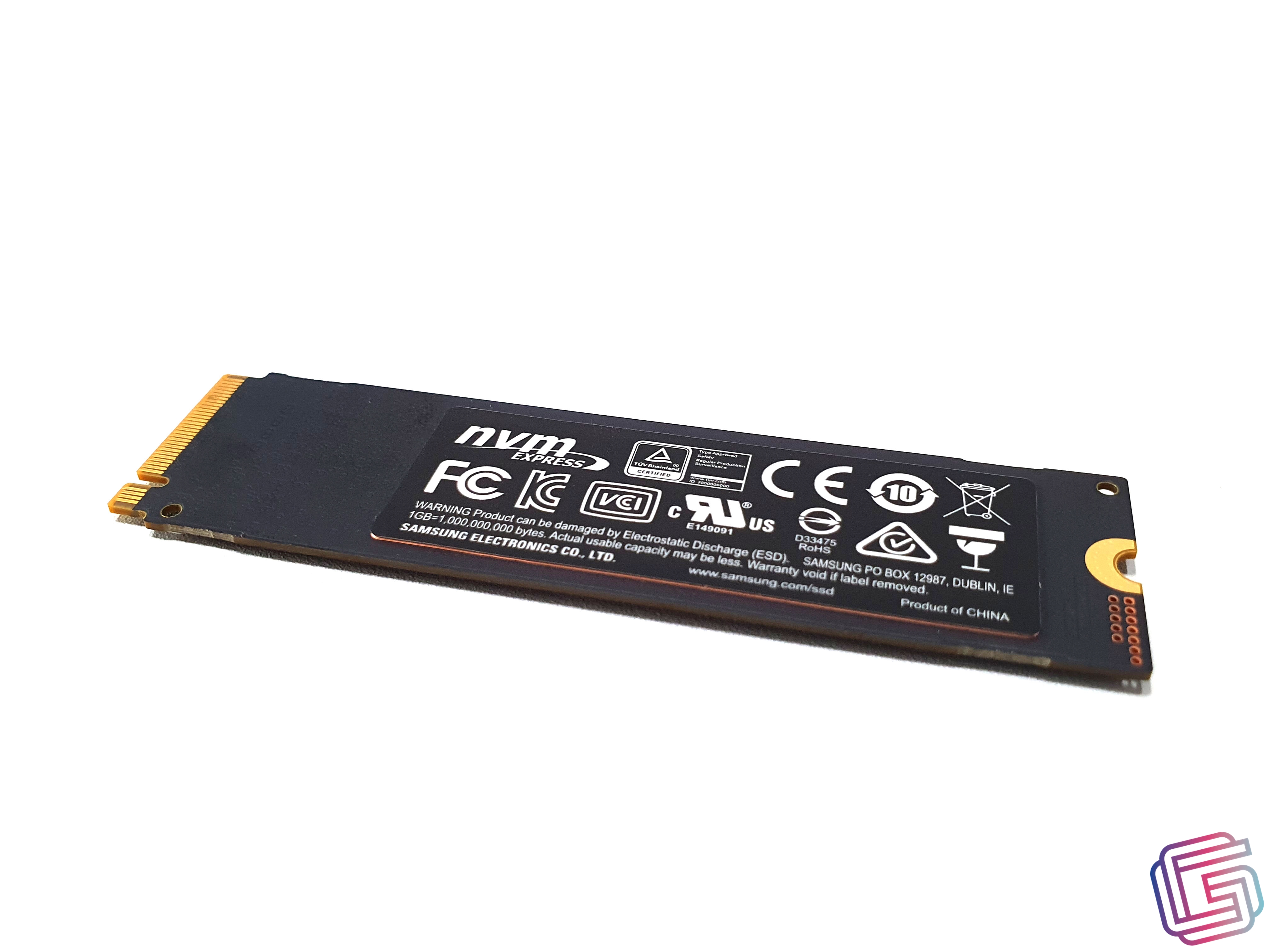 970 EVO PLUS NVMe SSD는 M.2 2280 형식이며 뒷면에는 구리 스티커가 붙어 있어 발열 해소에 도움을 줍니다.