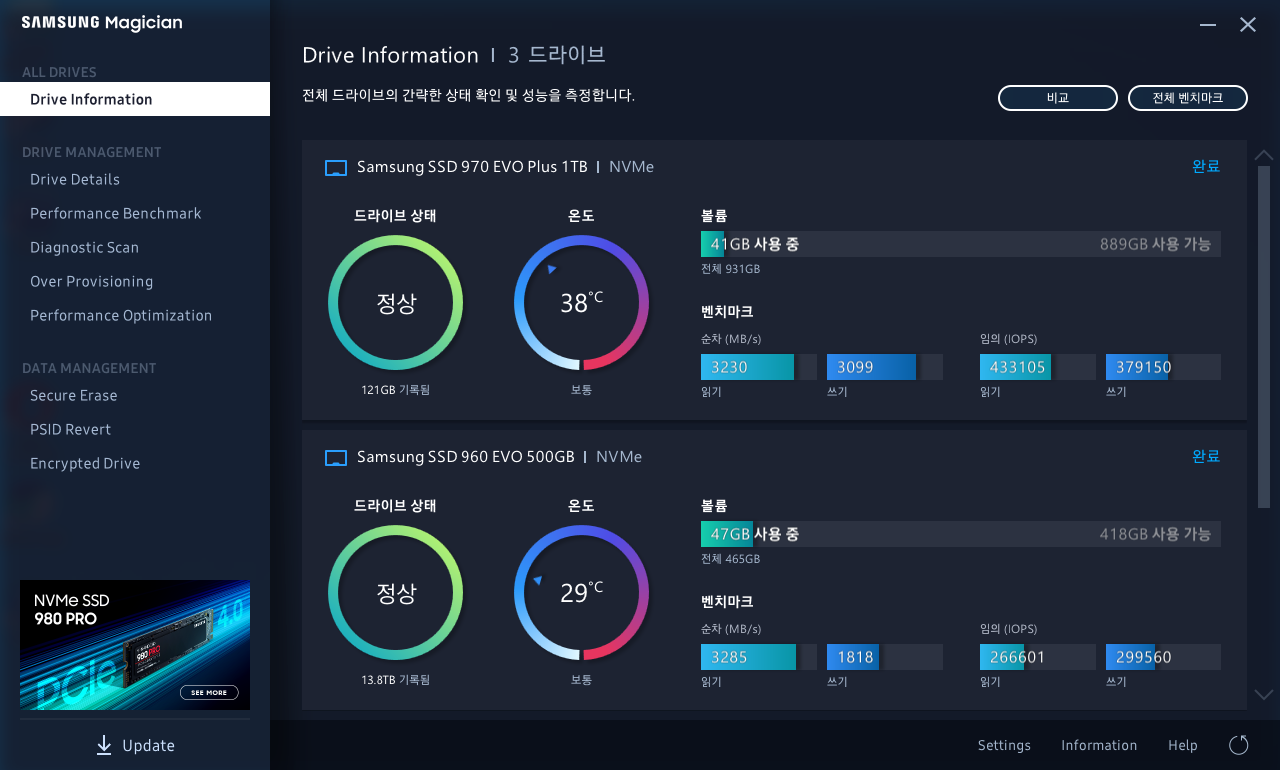 SAMSUNG Magicion을 설치하면 드라이브의 상세 정보 및 벤치마크 Over Provisioning 등 다양한 설정을 할 수 있습니다.